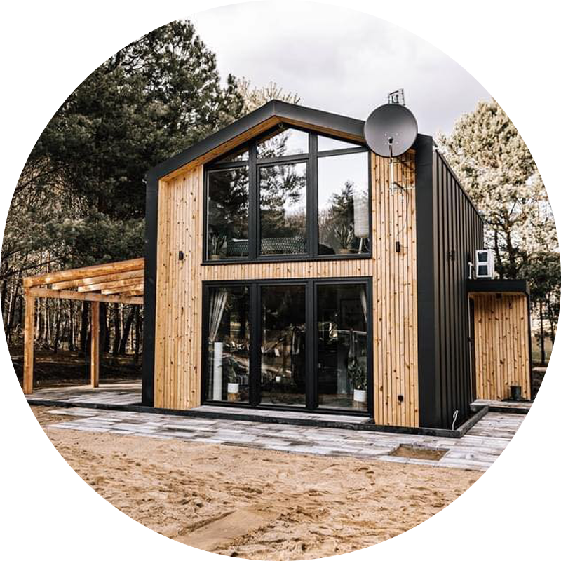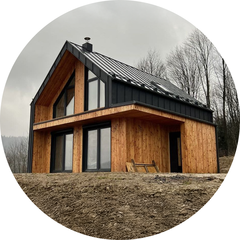 Szkielet naszych domów całorocznych wykonany jest z certyfikowanego, suszonego i mechanicznie struganego drewna klasy C24 oraz elementów KVH i BSH. Takie rozwiązanie zapewnia wysoką trwałość, stabilność i elastyczność konstrukcji.